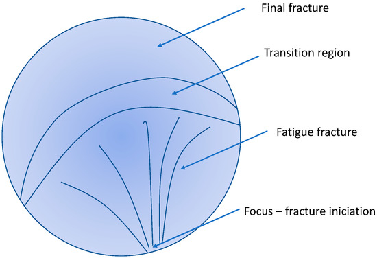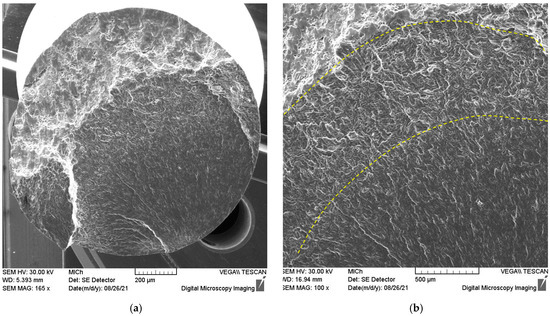 The general view of the fracture surface of the broken sample after the fatigue test is shown in Figure 13a. It is obvious that the fracture surface exhibits three zones, as illustrated in Figure 14.