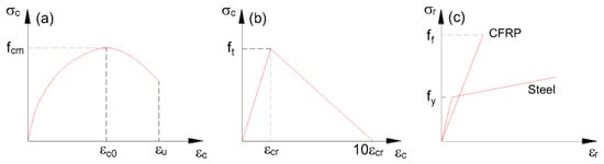 where σc and εc are concrete stress and strain, respectively; fcm = fck + 8, in which fcm and fck are concrete mean and characteristic cylinder compressive strengths, respectively; εc0 is the strain at peak stress; k is a coefficient. The above equation is valid when εc ≤ εu, in which εu is the ultimate concrete compressive strain. The concrete in tension shows elastic behavior before cracking and linearly tension-stiffening behavior after cracking, as illustrated in Figure 1b, where ft is the concrete tensile strength; and εcr is the cracking strain. The stress–strain (σr − εr) curves for reinforcement bars are shown in Figure 1c. CFRP bars are linear-elastic until their rupture strength ff; and steel bars are linear-elastic until their yield strength fy, followed by linear strain-hardening with a modulus of 0.015 times the elastic modulus.
