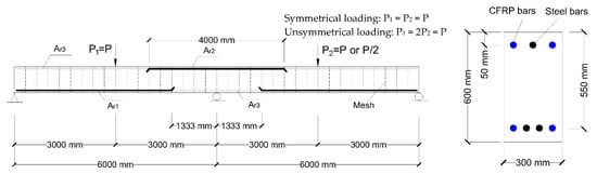 RC beams with two identical spans symmetrically or unsymmetrically subjected to center-point loading, as shown in Figure 2, are used in this part of the investigation. For symmetrical loading, P1 = P2 = P, where P is the applied load; P1 and P2 are the applied load at the left-hand and right-hand spans, respectively. For unsymmetrical loading, P1 = 2P2 = P. The areas of tensile bars at midspan and center support, Ar1 and Ar2, are 3000 and 2000 mm2, respectively. The area of compressive bars, Ar3, is 600 mm2. Different levels of hybrid bars (Af/Ar) are used, i.e., Af/Ar = 0.0, 0.25, 0.5, 0.75 and 1.0, where Af is the area of CFRP bars, and Ar is the total area of CFRP/steel bars. The beams are reinforced only with steel bars in the case for Af/Ar = 0.0, and CFRP bars in the case for Af/Ar = 1.0. The rupture strength, rupture strain and elastic modulus of CFRP bars are 1450 MPa, 1.09% and 133 GPa, respectively; the yield strength and elastic modulus of steel bars are 530 MPa and 200 GPa, respectively. The cylinder compressive strength of concrete (fck) is 30 MPa. Prior to the numerical parametric investigation, a mesh sensitivity analysis is carried out. The analysis shows that a smaller size of beam elements causes a smaller plastic rotation, but it also leads to a larger element curvature and hence a smaller element stiffness. A larger curvature would also counteract the influence of element size on the plastic rotation (the integral of curvatures on the length of the yielded element). In other words, the mesh size influences both the plastic rotation and flexural stiffness of the critical elements. As a result, moment redistribution is also size-dependent due to the combined effects of plastic rotation and flexural stiffness. In the current finite element mesh, the two-span beam is equally divided into 36 elements having a length of 333.33 mm each, as illustrated in Figure 2.