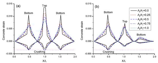 Figure 3 shows the concrete strain distribution at ultimate under symmetrical/unsymmetrical loading. Crushing failure takes place once concrete gets to its ultimate compressive strain. At symmetrical loading, the RC beam with steel bars (i.e., Af/Ar = 0.0) is crushed at midspan while the concrete strain at center support is still well below its ultimate capacity. The RC beams with CFRP and hybrid CFRP-steel bars (i.e., Af/Ar > 0.0) are crushed at center support and the concrete strain at midspan is close to its ultimate capacity. In addition, these beams exhibit obviously larger compressive strain over non-critical regions than the RC beam with steel bars as shown in Figure 3a, indicating better exploitation of these regions. At unsymmetrical loading, all the beams fail by concrete crushing at the critical midspan, while at failure concrete at center support is far below its ultimate capacity. The RC beam with steel bars exhibits lower exploitation of the non-critical regions than beams reinforced with CFRP and hybrid bars, as shown in Figure 3b.