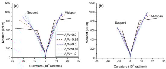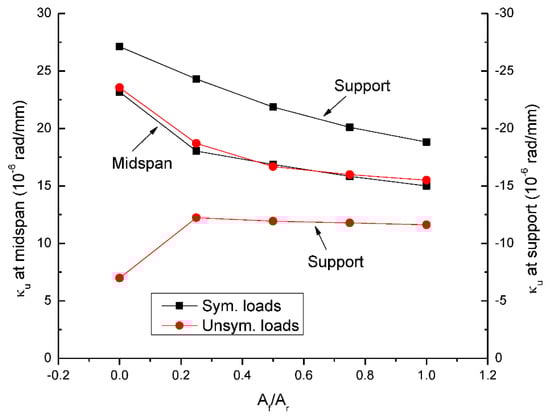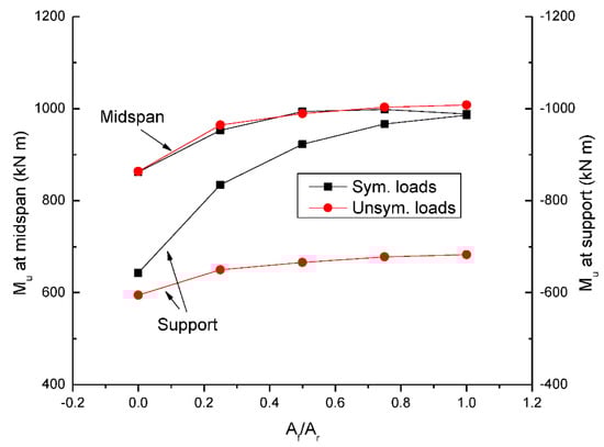 Figure 6 shows the change in ultimate curvature with varying Af/Ar. It is seen that the curvature in critical sections decreases as Af/Ar increases. In addition, the midspan curvature is lower (higher) than the support curvature at symmetrical (unsymmetrical) loading. At a given Af/Ar ratio, unsymmetrical loading leads to comparable midspan curvature but remarkably lower support curvature, when compared to symmetrical loading.