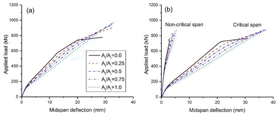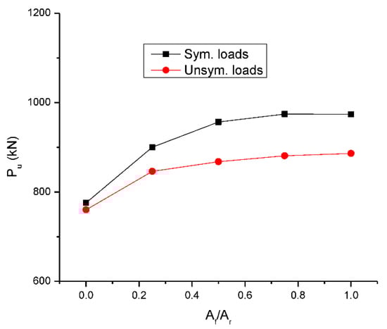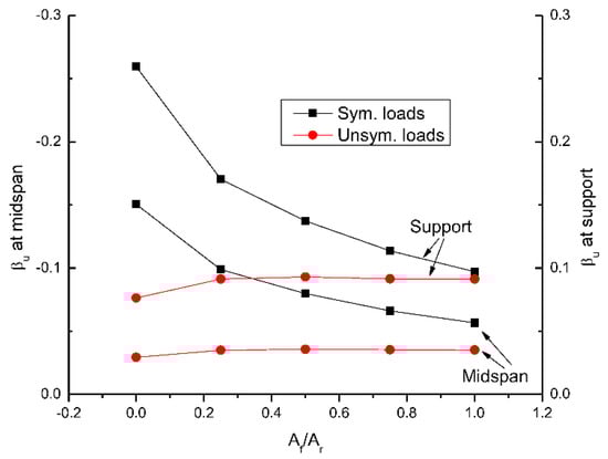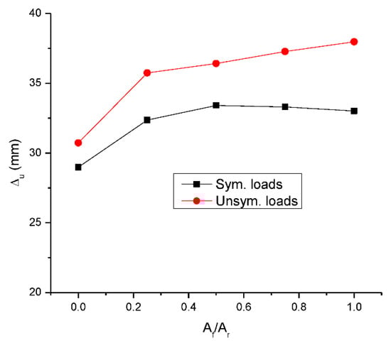 Figure 9 shows the change in ultimate deflection with varying Af/Ar. The ultimate deflection is increased by 11.7% at symmetrical loading and by 16.3% at unsymmetrical loading when Af/Ar increases from 0.0 to 0.25. With continuous increases in Af/Ar, the ultimate deflection hardly changes (at symmetrical loading) or slightly increases (at unsymmetrical loading). At a given Af/Ar ratio, unsymmetrical loading leads to 6.0–15.0% higher ultimate deflection than symmetrical loading.
