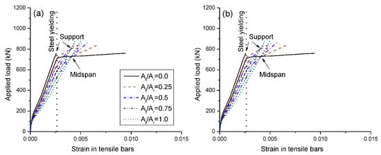 Figure 10a,b show the load versus tensile bar strain behavior of beams under symmetrical and unsymmetrical loading, respectively. The beams with different Af/Ar ratios exhibit the same strain development behavior until cracking. After cracking, a higher Af/Ar ratio leads to a quicker increase in bar strain. In the case for Af/Ar = 1.0 (i.e., RC beam with CFRP bars), the development of post-cracking strain in bars shows a linear manner until the ultimate. For beams fully or partially reinforced with steel bars (Af/Ar < 1.0), the strain development in bars is influenced by the steel yielding, while the degree of influence diminishes as Af/Ar increases, as demonstrated in Figure 10. At ultimate, all steel bars have yielded except at center support of the RC beam with steel bars under unsymmetrical loading, in which steel bars have not reached (but are close to) their yield strain.