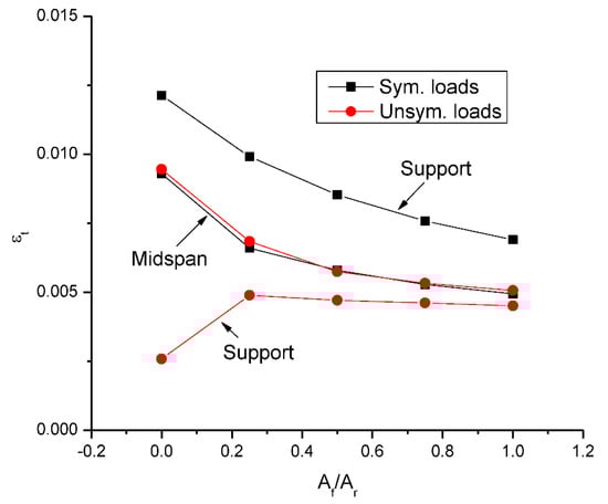 Figure 11 shows the change in ultimate strain in tensile bars with varying Af/Ar. At symmetrical loading, the ultimate bar strains at midspan and center support decrease as Af/Ar increases. At a given Af/Ar ratio, the bar strain at midspan is substantially (around 30%) lower than that at midspan. At unsymmetrical loading, the bar strain at midspan tends to decrease as Af/Ar increases, while the bar strain at center support is remarkably increased by 89.4% to 4883 με when increasing Af/Ar from 0.0 to 0.25, and tends to stabilize thereafter. Unsymmetrical loading leads to comparable bar strain at midspan but substantially lower bar strain at center support compared to symmetrical loading.
