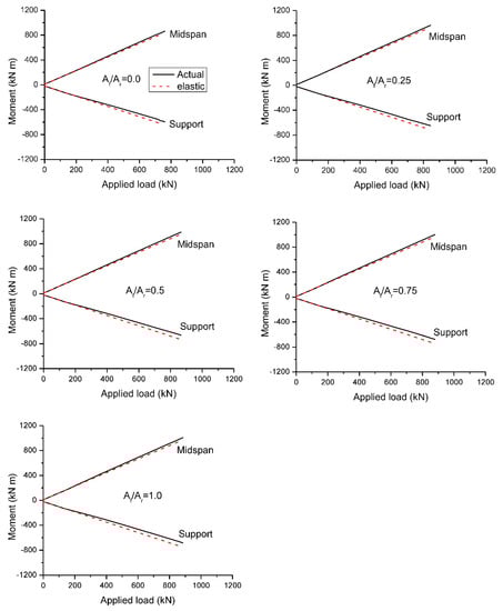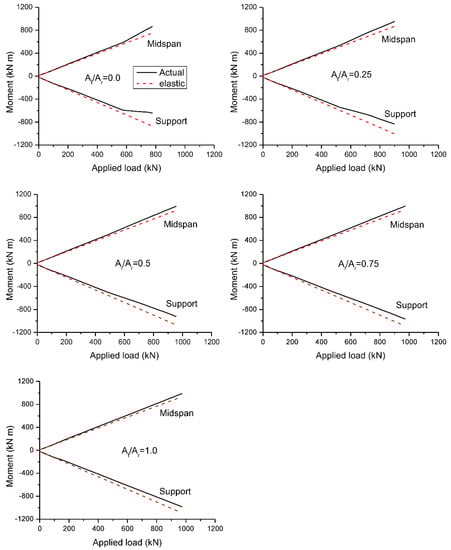 At symmetrical loading, as cracks occur firstly at center support, bending moments are redistributed away from this critical section. Consequently, the moment growth is slower at center support and quicker at midspan. The difference between actual and elastic moments at center support appears to be more apparent than that at midspan, as illustrated in Figure 12. The beams with various Af/Ar ratios exhibit approximately identical load-moment behavior until yielding of steel bars (if any) at center support. After that, the moment development is strongly dependent on the Af/Ar ratio, i.e., the higher the Af/Ar ratio, the smaller the deviation between actual and elastic moments.