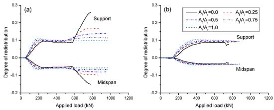 Figure 15 shows the change in moment redistribution at ultimate with varying Af/Ar. A list of elastic, ultimate moments and degree of redistribution in beams with different hybrid levels under symmetrical/unsymmetrical loading is presented in Table 1. It is seen that in the case of symmetrical loading, moment redistribution decreases as Af/Ar increases. In the RC beam with steel bars (Af/Ar = 0.0), the degree of redistribution is 26% at center support and −15% at midspan. Increasing Af/Ar from 0.0 to 0.25, 0.5, 0.75 and 1.0 leads to a decrease in moment redistribution by 34%, 47%, 56% and 62%, respectively. In the case of unsymmetrical loading, the effect of Af/Ar on moment redistribution is ignorable. The degrees of redistribution are around 9% at center support and −3.5% at midspan, irrespective of the Af/Ar ratio. At Af/Ar = 0.0 (i.e., RC beams with steel bars), unsymmetrical loading leads to significantly lower moment redistribution than symmetrical loading. The redistribution difference between symmetrical and unsymmetrical loading is substantially reduced as Af/Ar increases.