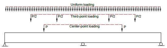In this section, available simplified equations based on the strain in tensile bars, εt, for predicting moment redistribution at the support section are evaluated. As the support section is non-critical when unsymmetrical loading is applied, only symmetrical loading is considered herein. Apart from center-point loading as used in the previous section, uniform loading and third-point loading are also considered in this part of investigation, as illustrated schematically in Figure 16.