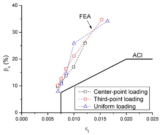 Figure 17 shows the FEA data regarding the βu-εt relationship at center support along with the ACI curve. According to FEA, the βu value increases with increasing εt and the βu-εt relationships by different types of loading exhibit good consistency. As far as the βu-εt relationship is concerned, the ACI code is coincident to the FEA data, showing that this code can reflect the tendency of the redistribution variation with the εt level. In addition, all of the FEA data are located above the ACI curve, suggesting that the ACI code is conservative. However, the code seems to be over-conservative at a high εt level, partly attributed to the neglect of the stiffness difference between the critical sections.