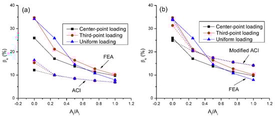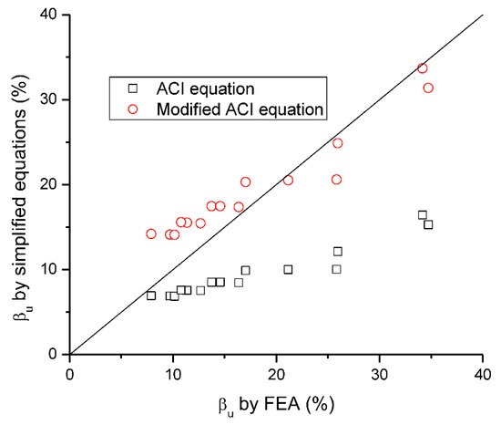 Comparison of βu-Af/Ar relationships by FEA and simplified equations: (a) ACI equation; (b) modified ACI equation.