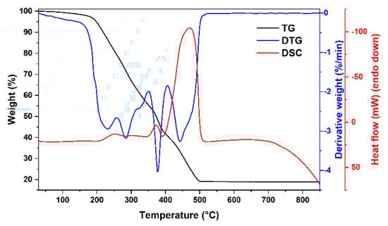 The thermal decomposition behavior of the obtained gels as well as possible minimal annealing temperature were investigated by thermogravimetric analysis. TG/DTG/DSC curves of two xerogels with different compositions (Mg-Fe-O and Mg-Y-Fe-O) are depicted in Figure 1 and Figure 2. The first degradation stage for both samples takes place in 50–130 °C range, where negligible weight loss (around 2%) can be seen. At these temperatures, the removal of adsorbed water occurs. Two degradation steps can be witnessed for Mg-Fe-O xerogel at 200–330 °C, while (0.8)Mg-(0.2)Y-(1.933)Fe-O xerogel has only one in this temperature range. These decomposition steps (where around 50% of the initial weight was lost) could be related to the decomposition of metal complexes with ethylene glycol and citric acid. A small exothermic peak found in DSC curve at around 250 °C supports the combustion reaction. Moreover, the next step centered around 370 °C in the DTG curve for both xerogels could be attributed to the thermal decomposition of metal nitrates and organic species. The last degradation step, in the 440–500 °C range for Mg-Fe-O xerogel and 380–470 °C range for (0.8)Mg-(0.2)Y-(1.933)Fe-O is related to pyrolysis as well as combustion of intermediates species formed during gelation and residual organic parts. Both xerogels lose around 80 °C of total weight according to TG curves. Interestingly, the sample containing 20 mol% of yttrium has a lower decomposition temperature compared to the sample with only magnesium and iron ions.