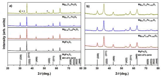XRD patterns of Mg1−xYxFe(2-−δ)O4, where δ = 0 (a) and δ = x/3 (b). An asterisk represents the diffraction peaks ascribed to YFeO3 impurity phase.