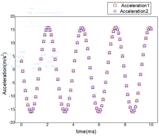 The acceleration response test was performed with the electromagnetic shaking platform to validate the accuracy of the responses of the acceleration. Three acceleration sensors were used while testing. One was the acceleration sensor for inputting signals and the other two were the responses of the outputting signals. The amplitudes of the acceleration response curves were obtained approximately the same way. The maximum error was less than 1% and the trends of the curves were almost consistent, which is shown in Figure 4. Therefore, the testing results showed that the stability and accuracy of the testing system was reasonable.