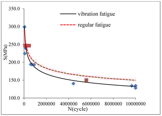 The specimen used in the vibration fatigue experiment and the regular fatigue testing is shown in Figure 5. The vibration fatigue S–N curve and the regular fatigue S–N curve were both obtained. They are shown in Figure 6.