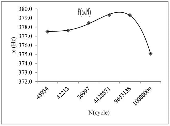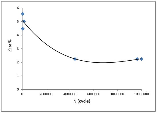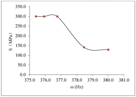 Several valuable results were obtained with the vibration fatigue and traditional fatigue test. The S–N curve of the vibration fatigue showed exactly the same trends as the traditional fatigue S–N curve. However, there was an extremely different value between the curves. The fatigue strength of the vibration fatigue decreased compared with the regular fatigue strength. There was a difference in the value of the two curves. Based on the experimental data analysis, the corresponding relationship between the vibration frequency and the fatigue life was obtained as F (ω, N), and it is shown in Figure 7. With the vibration fatigue testing, the frequency slightly improved at first, and then it reduced rapidly. During fatigue testing, the frequency changed as the crack grew through the material. The frequency decreased with the crack propagation. Moreover, the relationship between the vibration frequency and stress was also obtained, and it is shown in Figure 8. The frequency changed the stress state of the structure. With the short increase in frequency, the stress was cut down and then became a constant.
