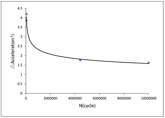 In addition, the vibration fatigue experimental end criteria for the aluminium alloy 7050 was studied. The acceleration reduction in the vibration fatigue experiment of aluminium alloy 7050 is presented in Figure 9. We can see from the rule curve of the acceleration reduction in Figure 9 that 2% was the acceleration reduction deference value for the vibration fatigue experimental end criterion of the aluminium alloy 7050. The frequency reduction for the vibration fatigue experimental end criterion of aluminium alloy 7050 is shown in Figure 10. We found that 2% was the frequency reduction deference value for the vibration fatigue experimental end criterion of aluminium alloy 7050, as is shown in Figure 10. Furthermore, a fracture analysis was conducted on the vibration fatigue specimen using a scanning electron microscope. The results are shown in Figure 11.