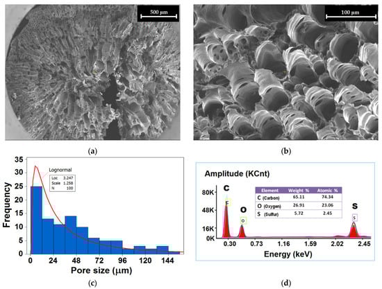 The porous morphology of the produced SPEEK polymeric beads (2–4 mm) was investigated by means of scanning electronic microscopy (SEM). The cross-sectional surfaces of the beads were inspected by SEM and the results are shown in Figure 1a,b. From the SEM images, the size of the pores was recorded and analyzed statistically in order to build the histogram of pore size distribution. According to Figure 1c, the data obeyed the log-normal distribution, and the pore size ranged from 1.13 μm to 151.44 μm, with an average value of 44.31 μm. Based on the location and scale parameters of the log-normal distribution, the mode was found to be 5.28 μm, indicating the most frequent, or probable, pore size in the data set. In addition, EDX analysis (Energy-dispersive X-ray spectroscopy, Figure 1d) revealed the presence of all expected chemical elements (C, O, and S).