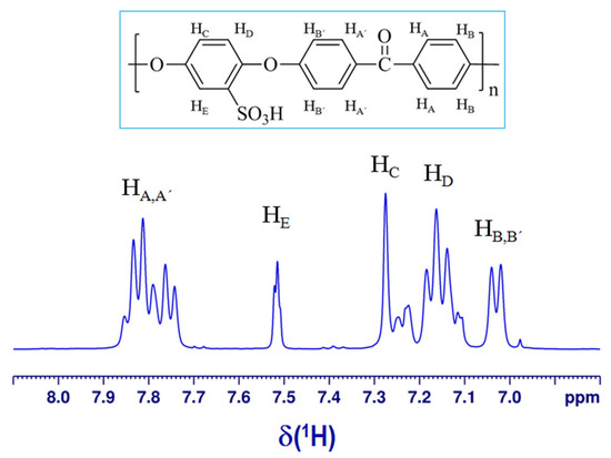 where, x is the number of HE per repeat unit (0 ≤ x ≤ 1) that should be established by solving Equation (3); and Hj = {HA, HA’, HB, HB’, HC, HD}. In our case, for a ratio of / = 6.636 × 10−2, the decision variable was found to be equal to x = 0.7030, which corresponds to a degree of sulfonation of DS = 70.3%. This value for DS (70.3%) determined from the 1H-NMR analysis is in reasonable agreement with DS (67 ± 2%) determined by the reverse titration method.