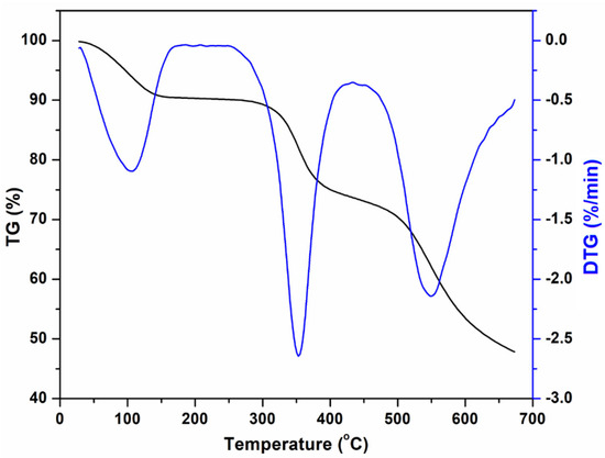 The thermogravimetric (TG) and thermogravimetric derivative (DTG) profiles of SPEEK are shown in Figure 4. As can be seen from Figure 4, three stages of mass loss can be distinguished for the SPEEK sample, that is: (i) 50–200 °C, (ii) 200–430 °C, and (iii) above 430 °C. The mass reduction occurring in the region 50–200 °C is due to the loss of physically and chemically bound water. In the second phase (200–430 °C) the mass loss of the SPEEK sample might be associated with the degradation of the sulfonic acid groups (−SO3H), which on cleavage can eliminate SO3 by volatilization [12]. And, in the last phase (>430 °C), the mass loss can be attributed to the thermal breakdown of the polymer chain.