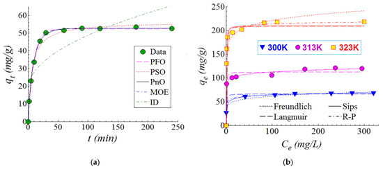 Adsorption of MB cationic dye onto the surface of the SPEEK adsorbent: (a) adsorption kinetics (experimental data and mathematical models) at T = 300 K, pH 6.0 ± 0.2, SD = 2 g/L, and C0 = 100 mg/L; (b) adsorption isotherms (experimental data and mathematical models), conditions: SD = 2 g/L, pH 6.0 ± 0.2, t = 180 min; solid, dashed and dotted lines represent predictions given by mathematical models.