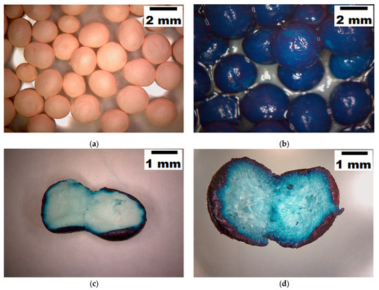 Morphologies of SPEEK beads: (a) initial state of SPEEK beads; (b) SPEEK beads after MB adsorption; (c) cross-section of a SPEEK bead after MB adsorption at 300 K; and (d) cross-section of a SPEEK bead after MB adsorption at 323 K.
