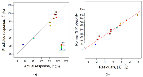 where Ŷ denotes the estimated response (predicted color removal) by the mathematical model. The developed mathematical model (Equation (4)) was subjected to a statistical test in order to prove its adequacy. For this, the analysis of variance (ANOVA) was employed [33,34]. The calculated ANOVA estimators are summarized in Table 4. In accordance with Table 4 (ANOVA), the relevant F-value (26.44) and small p-value (0.0006) pointed to a statistically significant model that can be applied to process simulation. The value of determination coefficient R2 indicated that the statistical model may explain about 94% of data variation. Moreover, the value of the adjusted coefficient Radj2 is close to the value of R2, suggesting that the mathematical model includes the conformant terms. The mathematical model was diagnosed in terms of the goodness-of-fit (Figure 7). The data located around the bisector (45° straight line) suggests that the predicted values are concordant with the experimental data (Figure 7a). Furthermore, Figure 7b highlights the normal graph of residuals. These represent the difference between observed and predicted values of the response (Yi − Ŷi). Hence, the normal plot of residuals ascertains the deviations of the residual errors from the normal distribution. The larger the deviations from the straight line, the greater the departures from normality. For the studied system (SPEEK/MB), the residual errors were scattered in accordance with the normal distribution (Figure 7b).