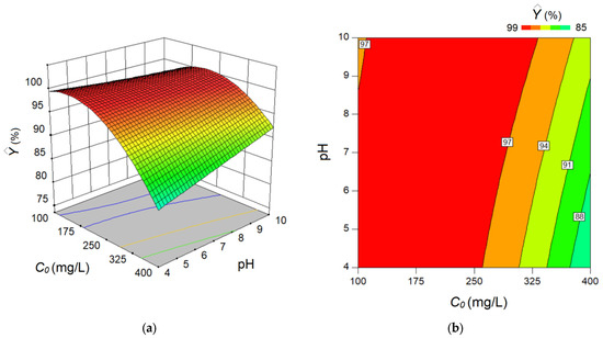 Response surface 3D diagram (a) and contour-lines 2D map (b) highlighting the mutual effect of factors: C0 (initial MB concentration) and pH of the aqueous solution, on the estimated response—removal efficiency (Ŷ, %).
