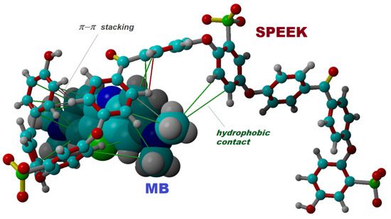 Finally, molecular docking simulations were done by a computer-assisted technique to reveal the intermolecular interactions between the SPEEK oligomer (receptor) and MB dye (ligand). The estimated interaction energy for attraction between ligand and receptor was equal to −31.79 kcal/mol, from which a contribution of 51% was attributed to VdW forces and 49% to Coulomb (electrostatic) forces. Moreover, the molecular docking pointed out that the receptor-ligand complex (SPEEK@MB) was stabilized by hydrophobic and π − π stacking interactions, which might be associated with the chemisorption mechanism as suggested by the evidence from the Dubinin–Radushkevich (D–R) isotherm.