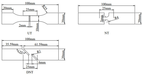 In the research, the changes of microstructure and tensile properties of 2024 alloy in as-cast, extrusion and extrusion+annealing states were investigated in detailed. Three types of tensile tests of different stress states were designed and carried out on the alloy materials, including Uniaxial smooth tension (UT), Notched tension (NT) and Double notched shearing tension (DNT). The three different types of samples were shown in Figure 2. Tensile tests were carried out at room temperature on a Shimadzu Autograph AGS-X machine with a constant strain rate of 5.6 × 10−4·s−1. Three groups of validation tests were carried out for each stress state.
