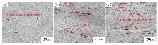 Figure 3 shows the grain structure of 2024 aluminum alloy in as-cast, extruded, and annealed states. For the microstructure characteristics of the as-cast homogeneous treatment, Figure 3a indicated that the matrix microstructure is coarse equiaxed α-Al grains, mainly composed of α solid solution, and the grain size is very uneven. There are few defects and large eutectic phases at the grain boundary, and the eutectic phase distribution at the grain boundary is not uniform. Figure 3b display the grain structure after extrusion. It can be seen that the grains are elongated along the extrusion direction, forming a long fibrous grain structure. The black impurity phase formed at the grain boundary tends to be homogeneous, but its size is still relatively large. In Figure 3c, the annealed grains tend to be homogeneous due to recovery and recrystallization, and the annealed grains still retain most of the fibrous characteristics and extend along the extrusion direction. Compared with that before annealing, the black impurity phases at grain boundaries are evenly distributed and the intergranular segregation is reduced.