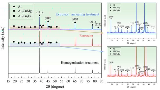 Figure 4 shows the XRD patterns of 2024 aluminum alloy under different treatment states. The content of the second phase and its changes during the extrusion and annealing treatments were determined by contrasting the standard PDF cards. The extruded 2024 aluminum alloy is mainly composed of Al matrix, a large amount of S phases and a few Al7Cu2Fe phases. Studies have indicated that the θ(Al2Cu) phase and T(Al20Cu2Mn3) phase are also present in 2024 aluminum alloy [13]. Their diffraction peaks cannot be observed in Figure 4 mainly due to their small amount, which is not enough for their diffraction by X-rays. Only the diffraction peaks of the Al matrix can be observed in the homogenized alloy material. The diffraction peaks of the S-phase are clearly observed after extrusion, which indicates that the S-phase precipitates during the extrusion process and its amount increases after the annealing treatment. In contrast, the amount of Al7Cu2Fe phase is basically unchanged, which is due to the fact that Al7Cu2Fe phase is a refractory phase.
