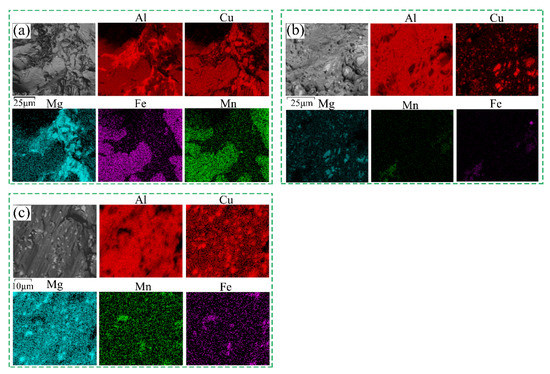 Figure 5 shows the EDS-mapping distribution of 2024 aluminum alloy in the states of homogenization treatment, extrusion and annealing treatment. Figure 5a shows the scanning element distribution diagram of the homogenization treatment alloy, and the result indicated that the massive insoluble phase AlCuFeMn is formed in the alloy. There is S phase precipitation and concentrated distribution, which is an important reason to affect the properties of the alloy. Importantly, it is observed that the coarse insoluble phase AlCuFeMn and S phase become small particles in the extruded alloy, and the distribution tends to be homogeneous (in Figure 5b). The contents of Fe and Mn elements decrease, and Cu and Mg elements dissolve into Al matrix during extrusion. After quenching, there are supersaturated solid solutions of Cu and Mg elements in the alloy, and some of them form S-phase secondary precipitation. These supersaturated solid solution and S phase play a vital role in solid solution strengthening and precipitation strengthening [22]. It is worth noting that, as shown in Figure 5c, the S-phase size is smaller and the distribution is more uniform in the alloy after annealing treatment. The content of Cu and Mg also decreases, which makes the plasticity of the alloy increase further, but the corresponding strength decreases.