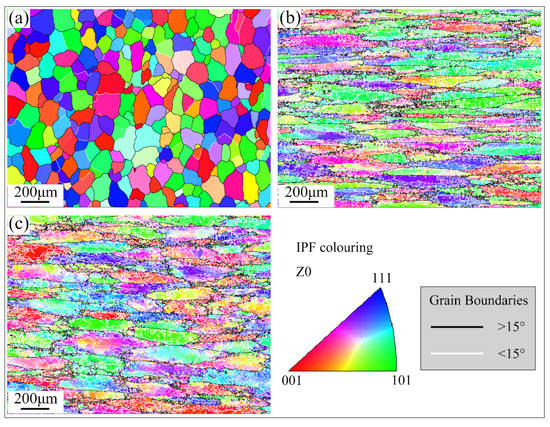 Inverse pole figures EBSD maps showing the grain structure of 2024 aluminum alloy by (a) homogenization treatment, (b) extrusion and (c) extrusion annealing treatment.