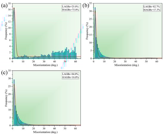 In this study, to further investigate the microstructure features of the alloy material, grain structure maps were obtained using electron backscatter diffraction (EBSD). Figure 6 shows the inverse pole figures (IPF) maps of 2024 aluminum alloy after homogenization treatment, extrusion and annealing treatment, respectively. The grains of the alloy in the homogenization treatment state in Figure 6a exhibit equiaxed grains and are dominated by high-angle grain boundaries (HAGBs). The grain size showed small equiaxed grains or sub-grains interspersed with large grain boundaries. From the figure, it can be statistically obtained that the average grain size in the as-cast state is 99.8 μm, and the grain size after extrusion is reduced to 13.27 μm. The grain structure of the extruded 2024 aluminum alloy is shown in Figure 6b. It can be observed that the grain microstructure is typical banded grains along the extrusion direction, and there are a large number of twins or sub-grains in the grain boundaries of the large deformation microstructure. The large banded grains are dominated by high-angle grain boundaries, while low-angle grain boundaries (LAGBs) are predominant within and between the banded grains. The overall grain size was refined significantly, and its average grain size was 13.57 μm. The microstructure of the annealed extruded alloy is shown in Figure 6c. The grains tend to be equiaxed from the typical ribbon organization, but still show an overall banded shape, with low-angle grain boundaries predominating. Figure 7 provides a statistical plot of the grain boundary orientation angle of alloy 2024 under different treatment conditions. Figure 7 shows the statistics of grain boundary orientation angle for alloy 2024 under different treatment conditions. As in Figure 7a, only 25% of the LAGBSs are observed during the homogenization treatment. After extrusion the percentage of LAGBs reaches 82.7%. It is well established that a large fraction of low-angle grain boundaries can effectively impede dislocation movement. The accumulation of dislocations causes an increased strength of the material.