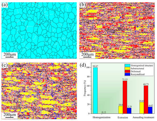 Figure 8 shows the recrystallization diagrams of 2024 aluminum alloy with various states. The content percentages of recrystallized, sub-grains and deformed tissues are shown in Figure 8d. For the homogenization treatment alloy, the grains are mainly homogenized equiaxed grains. Figure 8b shows the recrystallization diagram of the alloy after extrusion, in which it can be seen that the microstructure of the alloy after extrusion is dominated by the deformation structure, which accounts for 71.15%. A small amount of substructure is distributed inside the grains of the deformed matrix. The content of recrystallized characteristic is similar to that of substructure, which is uniformly distributed at the grain boundaries of the deformed grains. When the extruded 2024 aluminum alloy is annealed, it can be seen that the deformed tissue is still in the majority, but it is reduced compared with that free of annealing, while the content of recrystallized grains and substructure has increased significantly, 14.62% and 24.65%, respectively. This result indicates that the reversion and recrystallization occurred during the annealing treatment, making the grain structure tend to be equiaxed, thus affecting the mechanical properties of the alloy material.