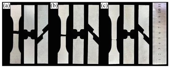 In order to verify the deformation ability of 2024 alloy material under different stress conditions, three tensile tests with different stresses were used in this study. Tensile specimens were cut on the extruded alloy along the extrusion direction and tested in axial tension on a testing machine. Figure 10 is the macroscopic fracture feature images of the 2024 aluminum alloy tensile sample with the states of homogenization treatment, extrusion and annealing treatment. In Figure 10a, the fracture morphology of the homogenized treatment shows a flush feature with brittle fracture along the grain boundaries. The fracture of the specimen after extrusion and annealing treatment fractures at an angle of 45° to the extrusion direction, and the fracture is an uneven tearing pattern, which is a macroscopic manifestation of tough nest fracture. From Figure 10a–c, it can be seen that the post-fracture length of the smooth tensile specimens increases sequentially, indicating that the plasticity of the specimens increases accordingly during the tensile process, which is consistent with the experimentally obtained performance results. In addition, the deformation of notched tensile and double-notched shear specimens in macroscopic form is minor. Since they received stress concentration, they are more likely to fracture under tensile stress. This also has led to the fact that their elongation is very low.