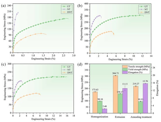 Engineering stress–strain curves of 2024 aluminum alloy under different stress conditions (UT, NT, DNT): (a) homogenization treatment, (b) extrusion, (c) extrusion annealing treatment and (d) comparison of uniaxial smooth tensile properties.