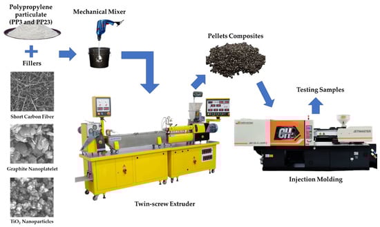 The PP-based composites used in this study were prepared by combining varying percentages of SCF, GNP, and nTiO2 with the PP matrix. The percentage of SCF in the composites varied from 0 to 20 wt. %. Meanwhile, for nanofillers, the concentration varied between 0 and 5 wt. %. Table 2 presents the detailed compositions of the composites used in this study. Initially, the PP polymer was dry-mixed with the desired percentage of fillers by a mechanical mixer. The mixed mixture was then fed and melt-mixed in a twin-screw extruder. The temperature at which the mixture was processed was selected within the range of 150–210 °C to obtain composite pellets. The injection molding machine was used to produce the tensile test specimens from the composite pellets. The barrel temperature of the injection molding process was selected within the range of 180–220 °C, while the nozzle temperature was 230 °C. The schematic of composites manufacturing process can be seen in Figure 2.