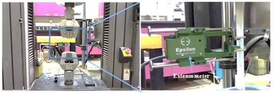 Uniaxial tensile tests were carried out per the ASTM D638-14 standard to obtain the mechanical properties of the composites [27]. The sample dimension was based on Type I of ASTM D638. Room temperature tests were performed using INSTRON 3385H with a 5 mm/min loading speed. An extensometer was attached to the samples to measure accurate strain. The ultimate tensile strength (UTS), tensile modulus, and strain at break were calculated from the stress–strain curve. Three experiments were performed at each composition to obtain statistically significant data. The tensile test’s setup can be observed in Figure 3.