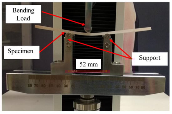 Flexural tests were performed according to ASTM D790-10 [28] on an INSTRON 3385H with a three-point bending standard attachment (Figure 4). Three experiments were carried out on each composition. The cross-head speed was adjusted to 1.5 mm/min, with a span support distance set at 52 mm. Flexural modulus and strength were calculated from the experiments.