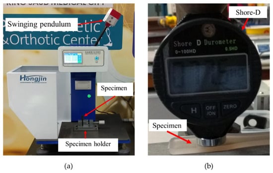 Hardness tests were conducted on the composites by Durometer according to ASTM D2240-15 [30] type D (Shore-D, Figure 5b). Five measurements were performed for every sample. Readings were taken 1 s after the needle touched the samples.