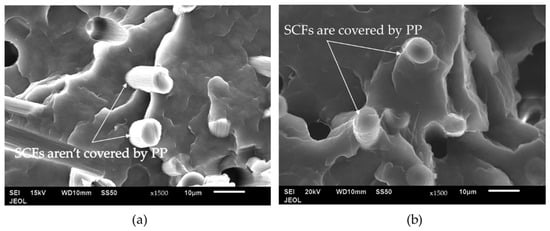 SEM images of 20 wt. % of SCF-reinforced Polypropylene (PP/20SCF) of (a) PP3 and (b) PP23.
