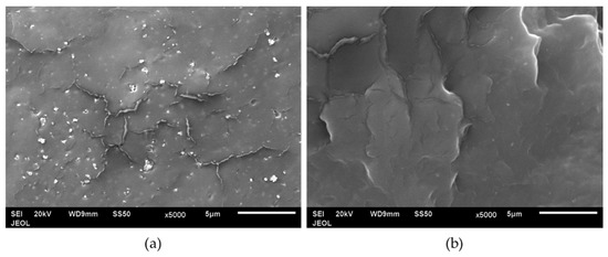 SEM images of PP/GNP composites are shown in Figure 7. These composites were composed of 5 wt. % GNP. It is observed from Figure 7b that the PP23 composite has a better dispersion compared to PP3. The agglomeration of GNP was observed in PP3 composites, as shown in Figure 7a.