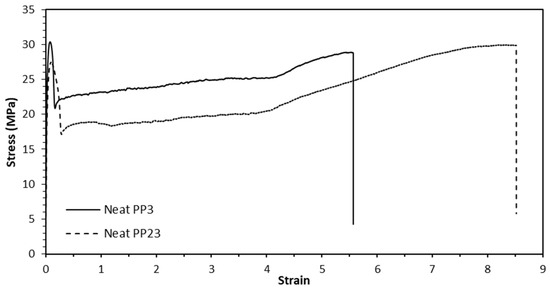 Figure 9 shows the typical stress–strain curves for neat PP3 and PP23. The average mechanical properties from the tensile test of the two different PPs are presented in Table 3. From the figure, it is observed that PP3 has a higher tensile modulus and UTS compared to PP23, but PP23 has a higher strain to break compared to PP3. Even though PP3 has higher UTS than PP23, PP23 has higher stress at fracture.
