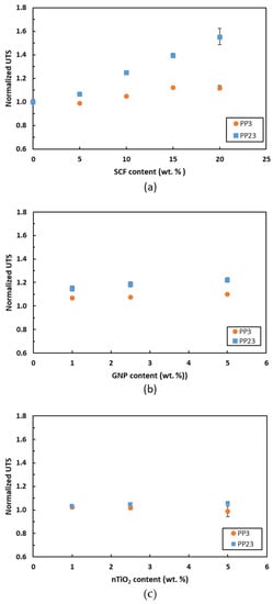 Normalized UTS of (a) PP/SCF, (b) PP/GNP, and (c) PP/nTiO2 composites.