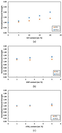 Normalized flexural strength of (a) PP/SCF, (b) PP/GNP, and (c) PP/nTiO2 composites.