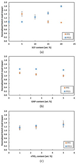 Normalized notch Izod impact toughness of (a) PP/SCF, (b) PP/GNP, and (c) PP/nTiO2 composites.