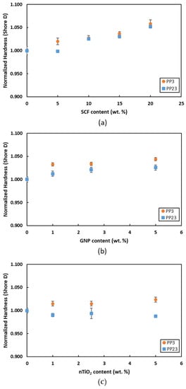 Normalized hardness (Shore-D) of (a) PP/SCF, (b) PP/GNP, and (c) PP/nTiO2 composites.