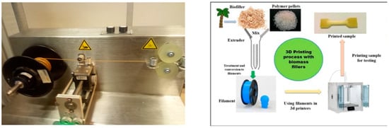 Among the many additive manufacturing techniques, molten deposition modelling (FDM—also known as Fused Filament Fabrication (FFF)) can be performed on thermoplastic polymers or composites, to allow a filament to be printed in layers. The main advantages of FDM are its low cost, relatively high speed, and potential to reinvent the design process [13]. Thermoplastic polymers reinforced with natural fibres (wood, flax, hemp, etc.) has a promising scale of specific mechanical properties [14] in combination with a reduced environmental imprint [15].
