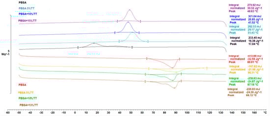 It is clear from Figure 6 that the addition of Typha fibres to the PBSA results in an increase in the crystallization temperature T c of the samples. This can be explained by the nucleation capacity of the Typha fiber for the crystallization of PBSA. As the amount of added fibres increases, T c and the crystallization enthalpy (ΔH c) of the PBSA phase increase with the addition of Typha fibres, indicating that the fibres accelerate the crystallization process. The most important effect of wood on the semi-crystalline structure polybutylene succinate co-adipate (PBSA), is its ability to act as a nucleation agent that promotes crystallization.