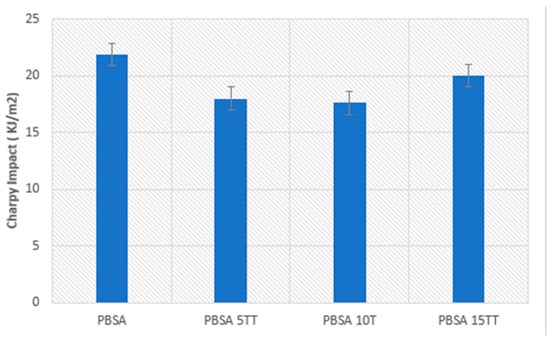 The results of the Izod impact test are presented in Figure 9. A decrease in the impact resistance of pure PBSA is observed with increasing the content of Typha stem fibres up to 5% Typha stem powder in the biomaterials. Indeed, this slight decrease is already reported for lignocellulosic fibre-reinforced polymer composites [28]. The mechanisms of impact energy absorption by the fibres are threefold, i.e., unbinding, tearing, and fracture, but due to the direction of printing and the screen angle of the fused deposition method, there is a good dispersion and distribution of the fibres in the polymer matrix and a decrease in absorption energy. This adhesion between the matrix and the fibre predisposes the material to a lower energy absorption. This leads to an improvement in the mechanical properties of the biomaterial. At 10% Typha stem fibre, the impact energy of the fibres increases, which shows that an optimal fibre concentration and an increase in impact properties have not yet been achieved [29,30]. This additional increase is due to a complete encapsulation of the fibres by the matrix. The reinforcement of the Typha stem powder in the composite leads to a decrease in the stress concentration due to the good adhesion between the Typha stem flour and the polymer. Crack propagation becomes difficult in biomaterials (Figure 10).